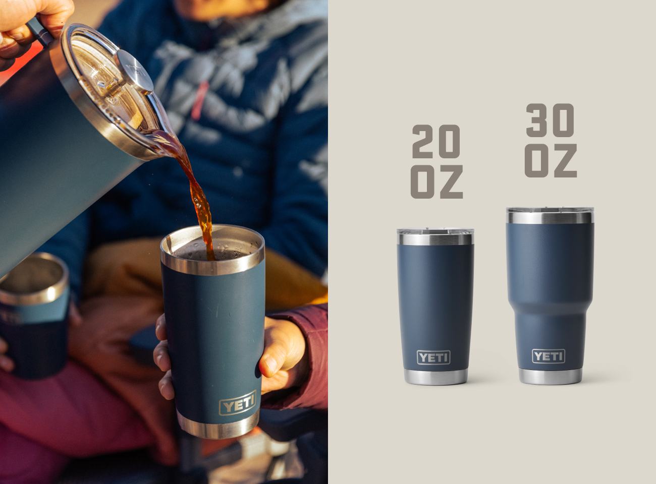 Espresso-Fans greifen am besten zu unseren Rambler® Bechern mit 4, 6 oder 8 oz (118, 177 und 236 ml). Für alle, die eine richtige Tasse Kaffee am Lagerfeuer genießen wollen, empfehlen wir unsere Rambler® Tassen mit 10 und 14 oz (295 und 414 ml). Und für alle, die ihren Kaffee unterwegs genießen wollen, gibt es unsere Rambler® Reisetassen mit 20 und 30 oz (591 und 887 ml), die auch auf holprigen Straßen und bei rauer See keinen Tropfen verschütten. Für alle, die ihren Kaffee lieber selbst zubereiten, ist unsere Stempelkanne genau das Richtige. Damit kannst du im Campinglager einen leckeren Kaffee machen und ihn warm halten, während du den Tag planst.