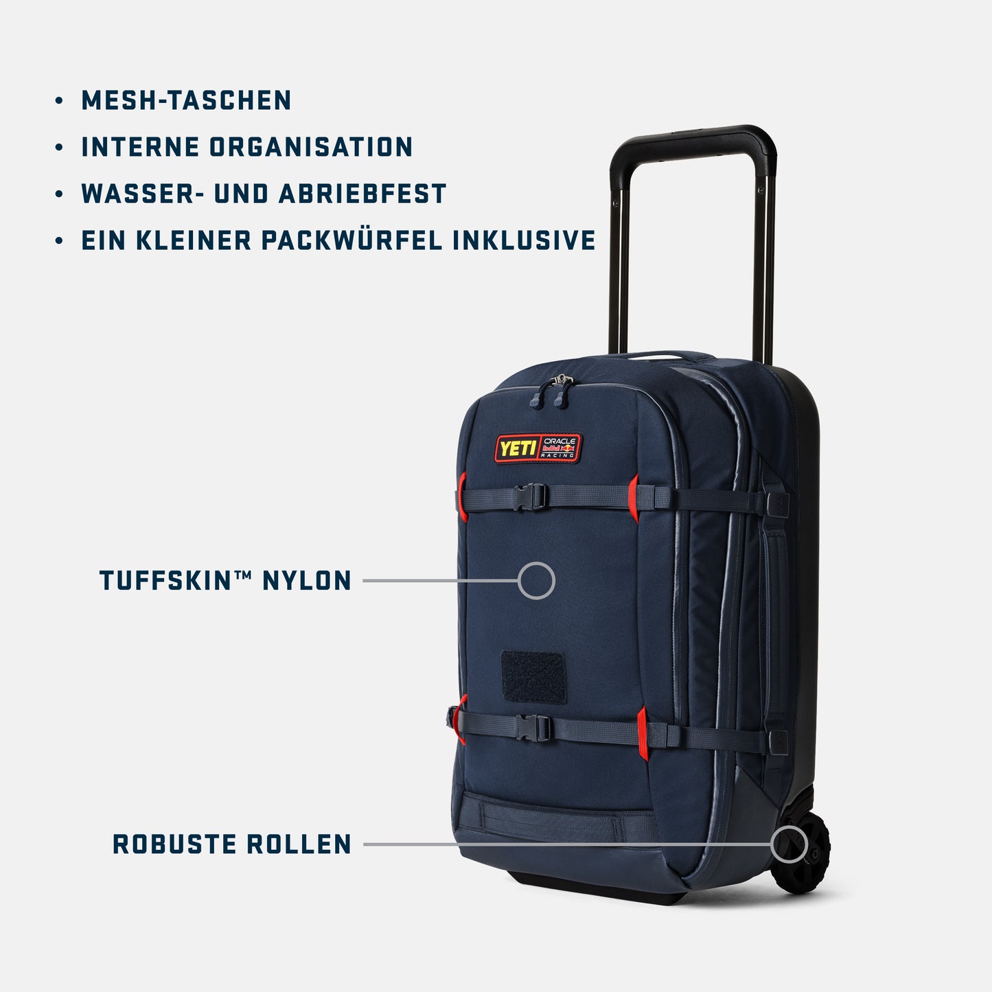Mach dich mit dem gleichen extrem strapazierfähigen Gepäck mit Rollen auf den Weg, den das Oracle Red Bull Racing Team für seine weltweiten Reisen verwendet.